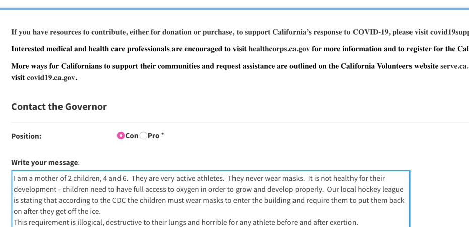 Please write to the Governor and let him know that the act of requiring children to wear masks is harmful, emotionally destructive and we will not stand for it.