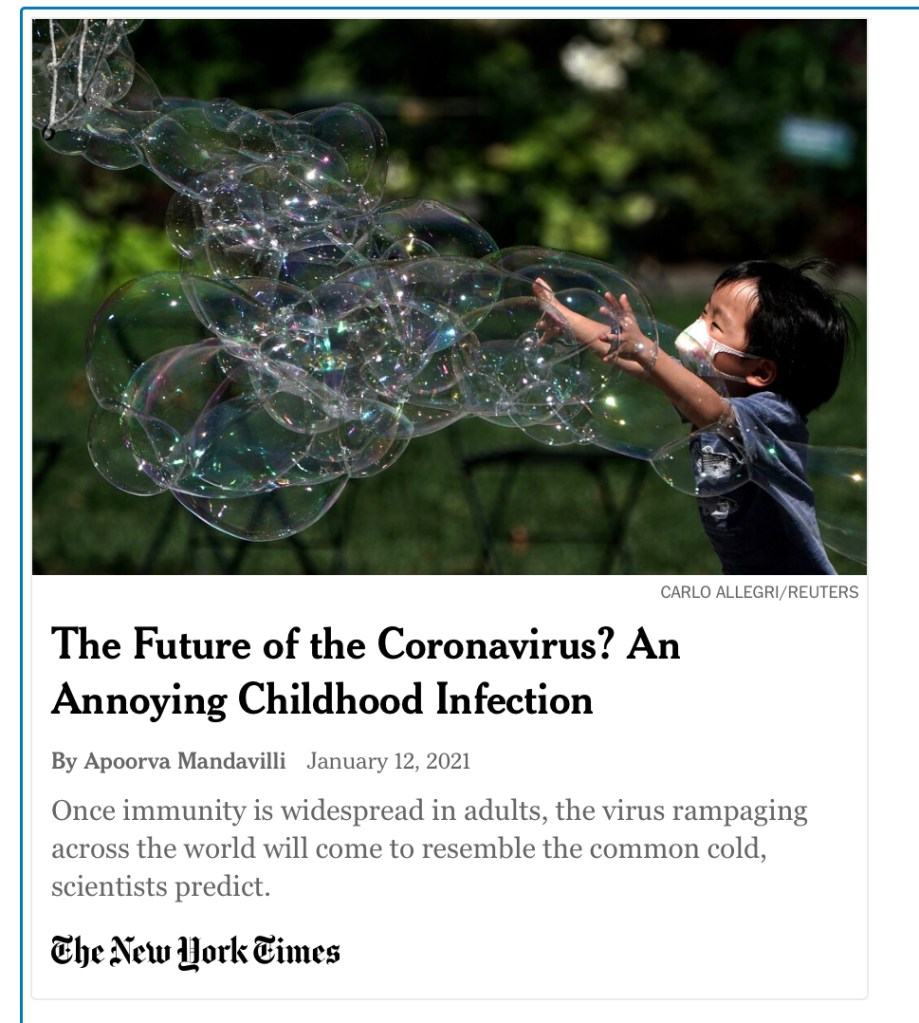 Now the New York Times is soothing the public instead of injecting it’s fear filled rhetoric. Covid is just an annoying infection. All of those words in the same sentence. All you need is exposure and to build immunity. HUH? But except you told me that my whole family is gunna die last month. Gross.