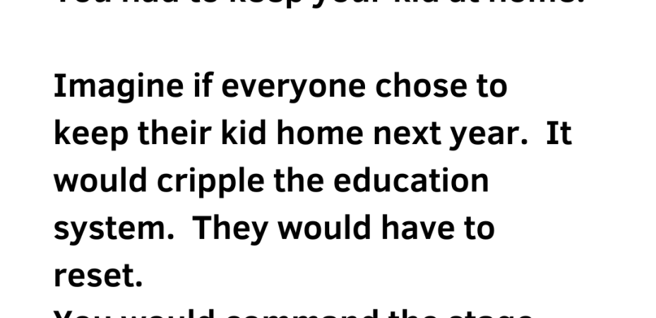 Ultimately it’s up to you parents. Send your kids to the school where all the indoctrination is happening, or don’t. Covid shut-down taught you that you don’t have to do it. Nationwide. You had to keep your kid at home. Imagine if everyone chose to keep their kid home next year. It would cripple the education system. They would have to reset. You command the stage again by showing them exactly who wears the crown, and you become an American again.